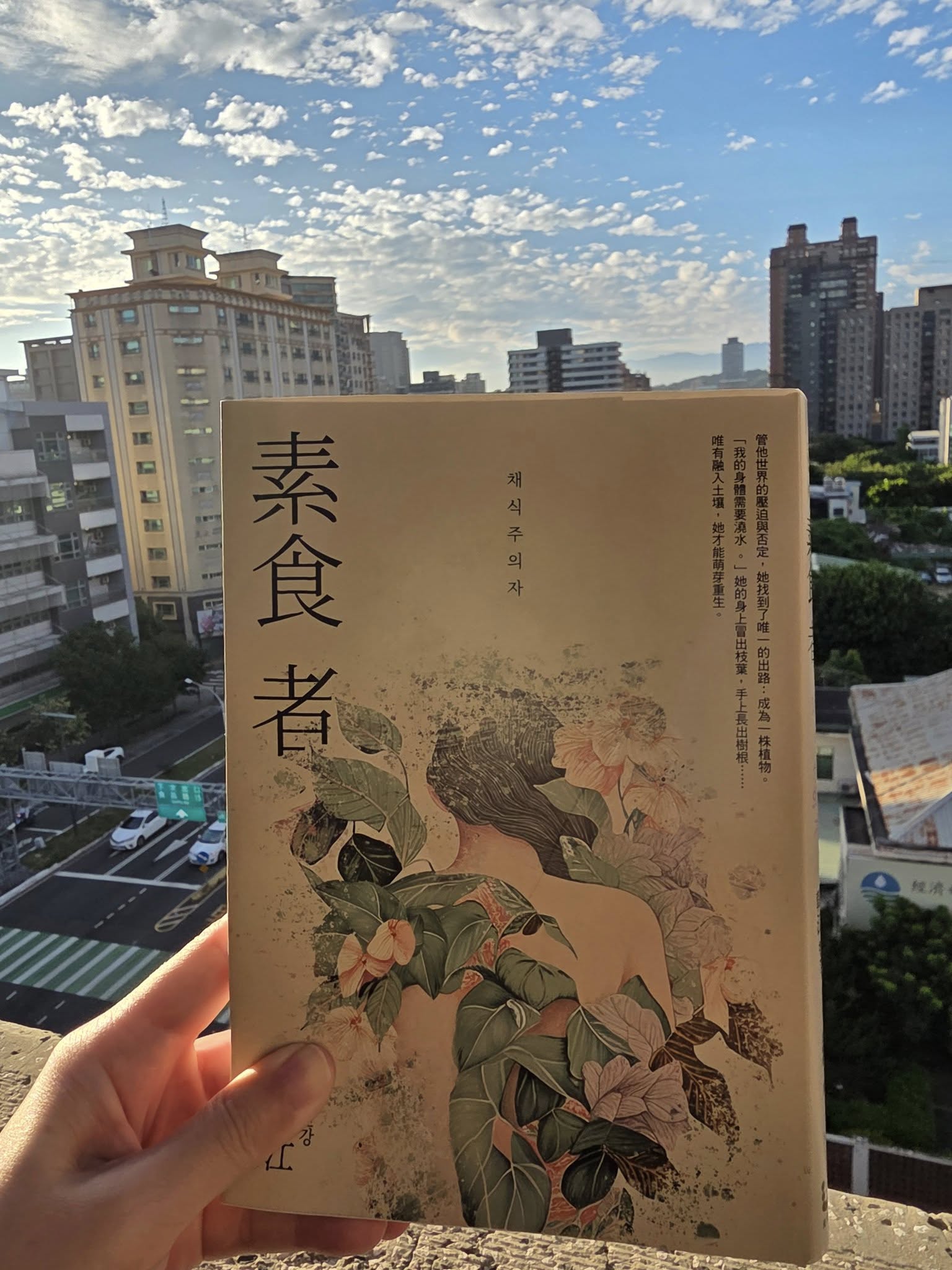 你們看這自拍,我一早起床,迎著暖陽晨曦,正在閱讀這本2024年諾貝爾文學獎得主 韓江的獲獎作品《素食者》嗎?